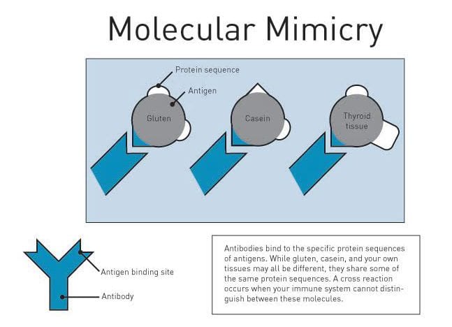 Molecular mimicry is the idea that your immune system reacts to something foreign, like a food, pathogen or chemical that looks so much like one of the many proteins that make up your body, that the immune system mistakenly attacks your tissues.